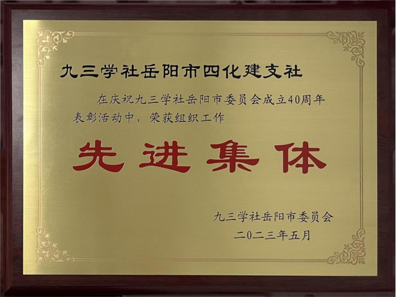 為進(jìn)一步加強(qiáng)基層組織建設(shè),更好地推動社務(wù)工作高質(zhì)量發(fā)展,九三學(xué)社岳陽市委根據(jù)《九三學(xué)社章程》和岳陽市各基層組織實(shí)際情況,對全市19個支社按量化考核評先。九三學(xué)社四化建支社近年來在加強(qiáng)組織建設(shè)、積極參政議政、努力開展調(diào)研和社會服務(wù)活動、改善社員老齡化等方面取得可喜的成績,也得到上級部門高度認(rèn)可,并在此次評先活動中脫穎而出,被評為九三學(xué)社岳陽市組織工作先進(jìn)集體。