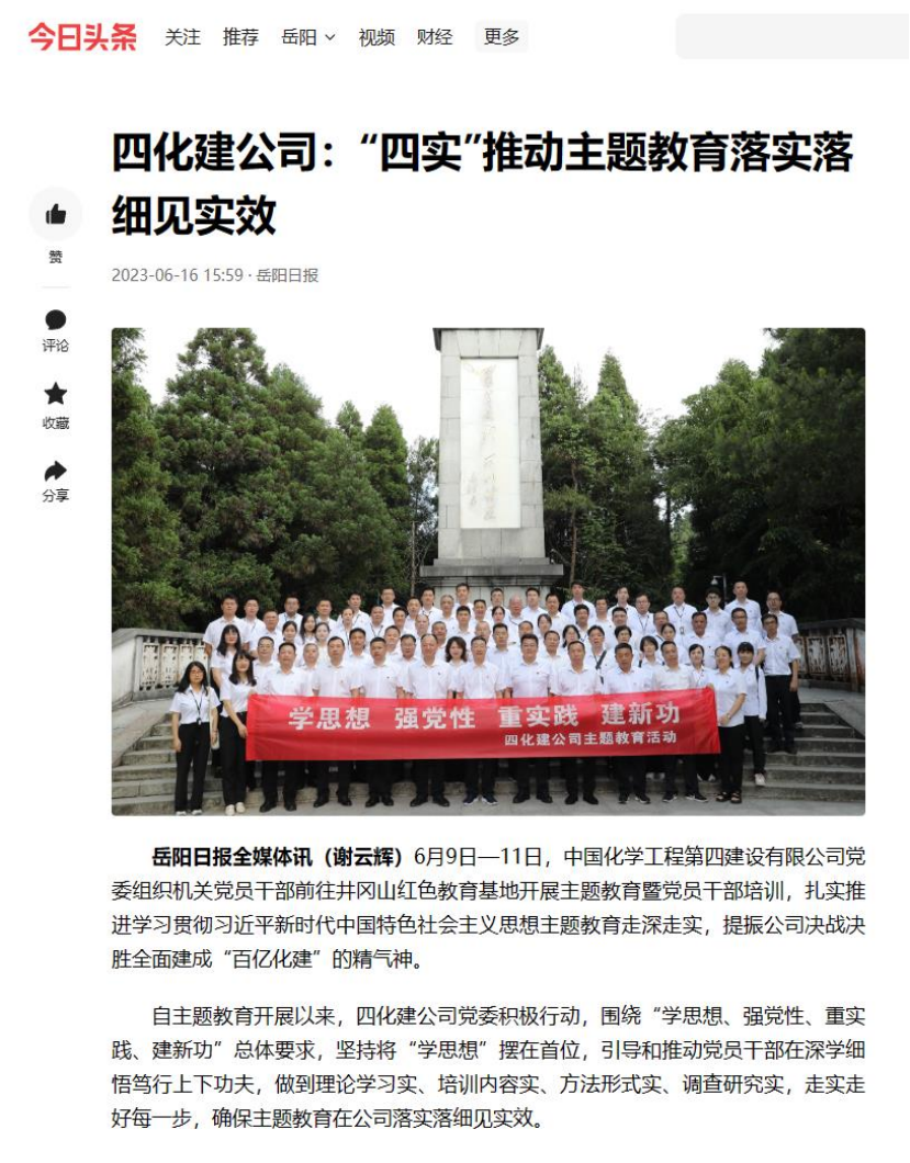 6月19日,《中國化工報》頭版以《四化建公司:“四實”確保主題教育見實效》,對公司扎實開展學習貫徹習近平新時代中國特色社會主義思想主題教育工作進行了全面系統報道,在全國石化行業引起廣泛影響。在6月16日,今日頭條也對公司主題教育工作進行了系統報道。現全文轉發如下: