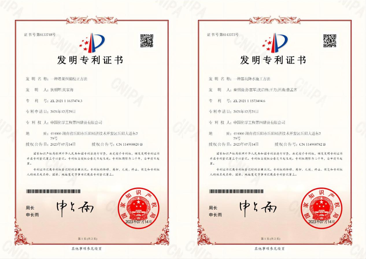 近日,從國家知識產(chǎn)權局傳來喜訊,公司新獲兩項發(fā)明專利。其中專利“一種塔架糾偏校正方法”,發(fā)明人為華東公司狄朝暉、吳家海,專利號ZL202111637474.3;專利“一種基坑降水施工方法”,發(fā)明人為華東公司秦紹清、孫富軍、沈啟偉、王力、汪濤、曹孟齊,專利號ZL202111573404.6。