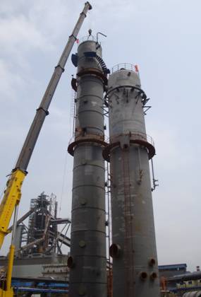 4月12日早上7點,項目部管理人員到達現場開始準備。7點30分,200噸吊車進入現場,韶鋼項目經理王建民來到現場進行指揮。首先吊裝的是高27米、重18.5噸的脫苯塔。上午9點整,脫苯塔順利安裝完成。吊車開始移位,準備吊裝高12米(總高31米)、重18噸的終冷塔上節。上午11點,終冷塔上節開始組對焊接。1個多小時后,吊車順利脫鉤,終冷塔順利安裝完成。