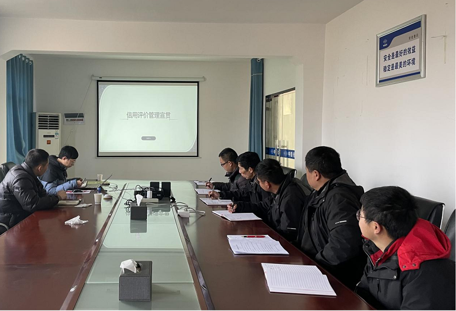 會上,公司經營部結合實際,對信用評價管理意義、信用評分在非化項目投標以及施工管理中的影響力進行了深入闡述;對信用評價管理的內容及項目實施細則、信用評分的標準進行全面解讀;強調了安全生產及質量管理標準化考評在信用評價管理工作中的重要性,并現場領學標準化考評文件。