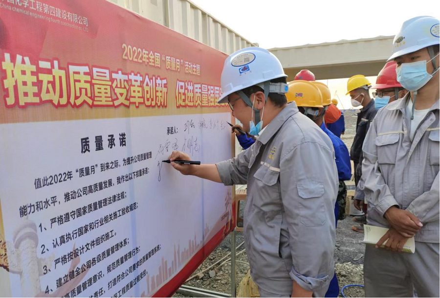 9月5日,華北公司凱賽項目部舉行2022年“質量月”活動啟動儀式。儀式上,安排部署了質量月活動具體落實措施。會上要求,嚴格按照活動方案組織開展各項工作,營造人人關心質量、人人重視質量、人人提升質量的濃厚氛圍,讓重視質量、共管質量成為工作常態。加強對施工重點環節的質量管理檢查和控制,嚴把各階段質量關口,切實提高工程實體質量,努力打造“化建湘軍”央企品牌。現場全體人員在宣傳牌上簽名,共同作出堅守質量底線、鑄造精品工程、助推企業高質量發展的莊嚴承諾。(通訊員 萬江博 尹文煜)