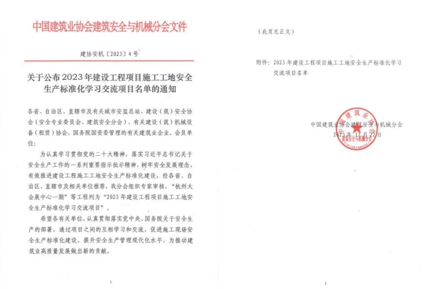 近日,中國建筑業(yè)協(xié)會建筑安全與機械分會公布《2023年建設工程項目施工工地安全生產(chǎn)標準化學習交流項目名單》,華東公司承建的中國絲路科創(chuàng)谷起步區(qū)1、3、7、8單元項目榮獲“全國建設工程項目施工工地安全生產(chǎn)標準化學習交流項目”稱號。