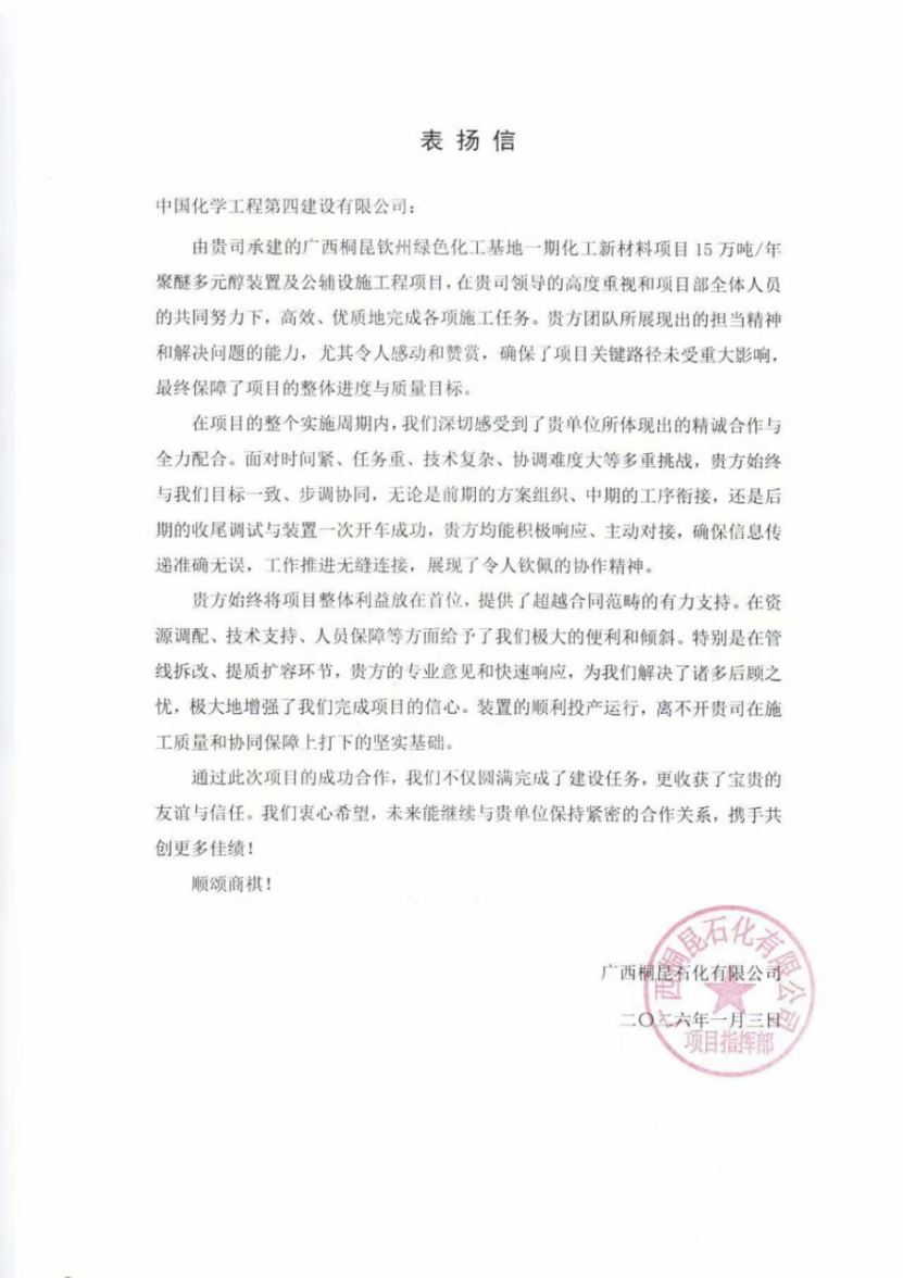 近日,華北公司收到廣西桐昆石化有限公司發(fā)來的表揚(yáng)信,對華北公司在廣西桐昆欽州綠色化工基地一期化工新材料項目15萬噸/年聚醚多元醇裝置及公輔設(shè)施工程建設(shè)中的出色履約給予高度評價。
