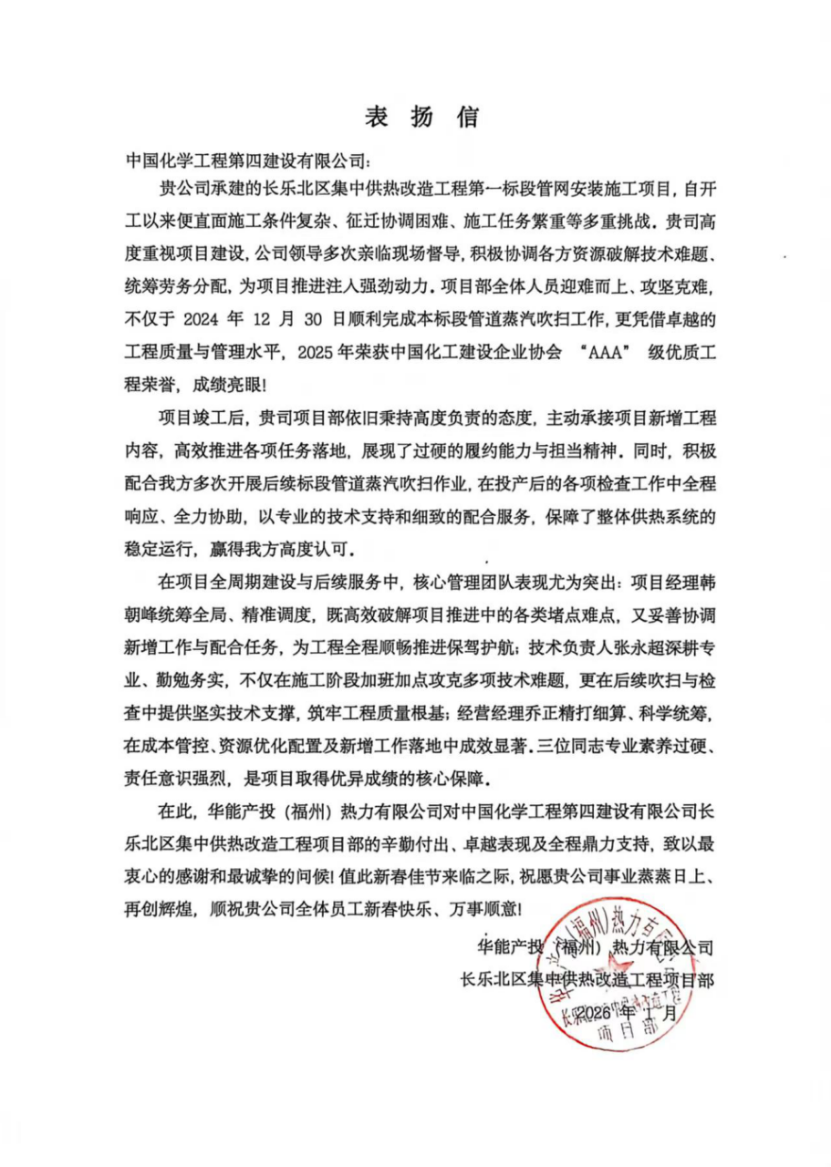 近日,東北公司收到華能產(chǎn)投(福州)熱力有限公司發(fā)來的表揚(yáng)信,對華能長樂東北區(qū)集中供熱改造工程第一標(biāo)段項目團(tuán)隊的優(yōu)質(zhì)履約、高效服務(wù)及管理團(tuán)隊的專業(yè)表現(xiàn)給予高度贊譽(yù)。