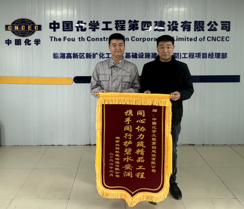 2月25日,湖南興臨環境治理有限公司向建筑工程公司臨湘項目部贈送“同心協力筑精品工程 攜手同行護碧水安瀾”錦旗,對臨湘高新區污水廠提能改造項目(一期)團隊的優異表現給予高度肯定。