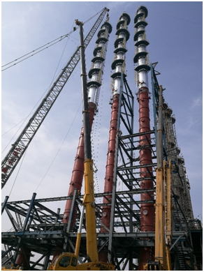 3臺精餾塔的吊裝就位標(biāo)志著該工程正式進(jìn)入施工關(guān)鍵階段,管道、設(shè)備等各專業(yè)施工作業(yè)全面進(jìn)入高峰期。