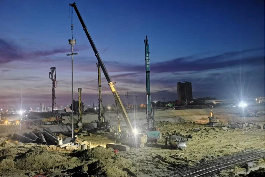 目前,項目A、B、D三個地塊已全面進入大干階段,現(xiàn)場投入鉆機14臺,保證每天完成樁基180根。現(xiàn)已完成樁基1769根,占三個地塊5453根樁基的32%,計劃9月13日前完成三個片區(qū)全部樁基施工和基坑支護工作,屆時項目將全面進入基礎施工階段。