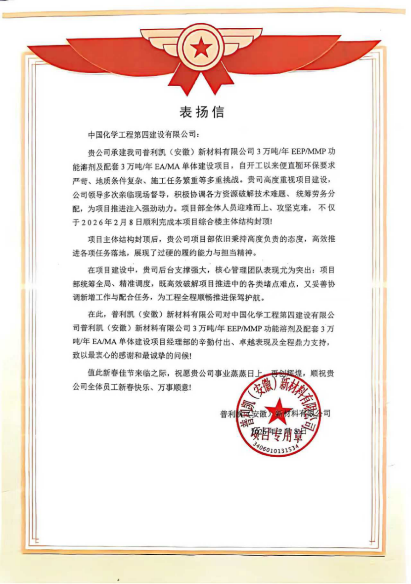 近日,由西部公司承建的普利凱(安徽)新材料有限公司3萬(wàn)噸/年EEP/MMP功能溶劑及配套3萬(wàn)噸/年EA/MA單體建設(shè)項(xiàng)目綜合樓主體結(jié)構(gòu)順利封頂,標(biāo)志著項(xiàng)目建設(shè)取得階段性勝利,正式轉(zhuǎn)入二次結(jié)構(gòu)及裝飾裝修施工階段。業(yè)主單位特發(fā)來表?yè)P(yáng)信,對(duì)項(xiàng)目團(tuán)隊(duì)的卓越表現(xiàn)給予高度評(píng)價(jià)。